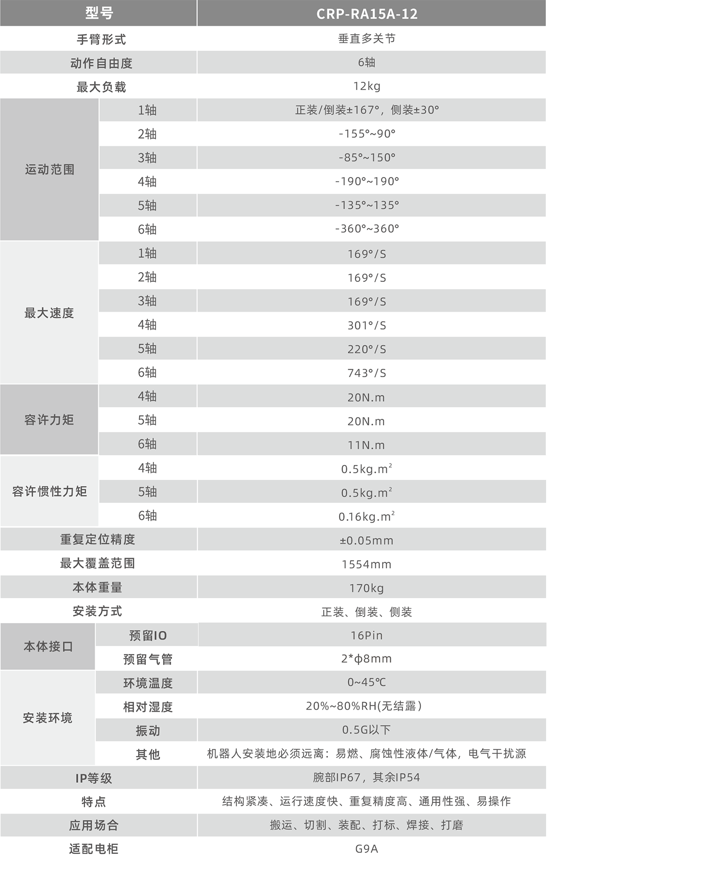 • 機器人整體結(jié)構(gòu)高度緊湊、輕量化,更加輕巧適用,尤其腕部更加小巧,滿足更多的場景。